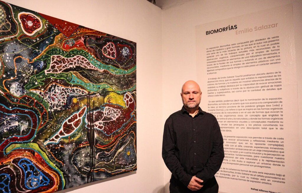 La exposición Biomorfías está compuesta por alrededor de veinte obras de mediano y gran formato, en las que el autor nos presenta una serie de lo más reciente de su pintura, en la cual es posible apreciar uno de los trabajos actuales más reconocibles de la abstracción orgánica, caracterizada por el empleo de formas onduladas basadas en elementos de una naturaleza reinventada, a través de la fluidez de sus formas y evitando el uso de elementos reconocibles, mediante el empleo de elementos plásticos con una libertad compositiva que le otorga a cada pieza un carácter sensitivo e informal.