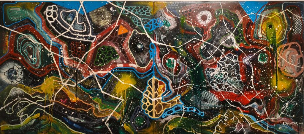 El trabajo de Emilio Salazar Touché podríamos ubicarlo dentro de la abstracción lírica, que es aquella que enfatiza la expresividad de los colores, las formas y la materia, sin mostrar referencias directas de la realidad, su obra destaca por su capacidad de evocar emociones profundas y subjetivas a través de la abstracción gestual de trazos fuertes y superpuestos, así como por la cantidad de detalles que ofrece cada lienzo.