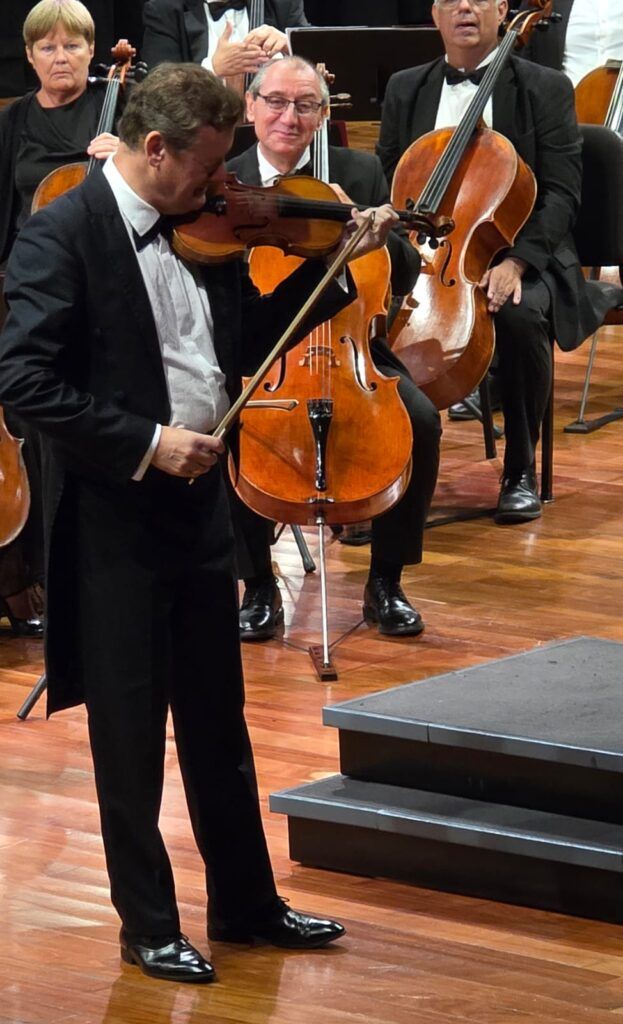 A la afinación de las cuerdas puntualmente indicada por el oboe se sumó el resto de los instrumentos entre escalas de metal y de madera, entre leves percusiones y melodías recortadas; hecho el silencio, aparecieron solista y director en el escenario saludando al público y agradeciendo los aplausos de bienvenida. Tras los segundos de un silencio expectante, el director levantó la batuta que se alzó sobre la orquesta hacia los timbales que con golpes precisos apenas audibles dieron paso a los alientos convocando al solista que desde ese primer movimiento, y a lo largo de toda la obra, mostró un virtuosismo pleno y una particular interpretación tocando de memoria en total armonía con el director que también prescindió de partitura induciendo la notable ejecución de los miembros de la orquesta.