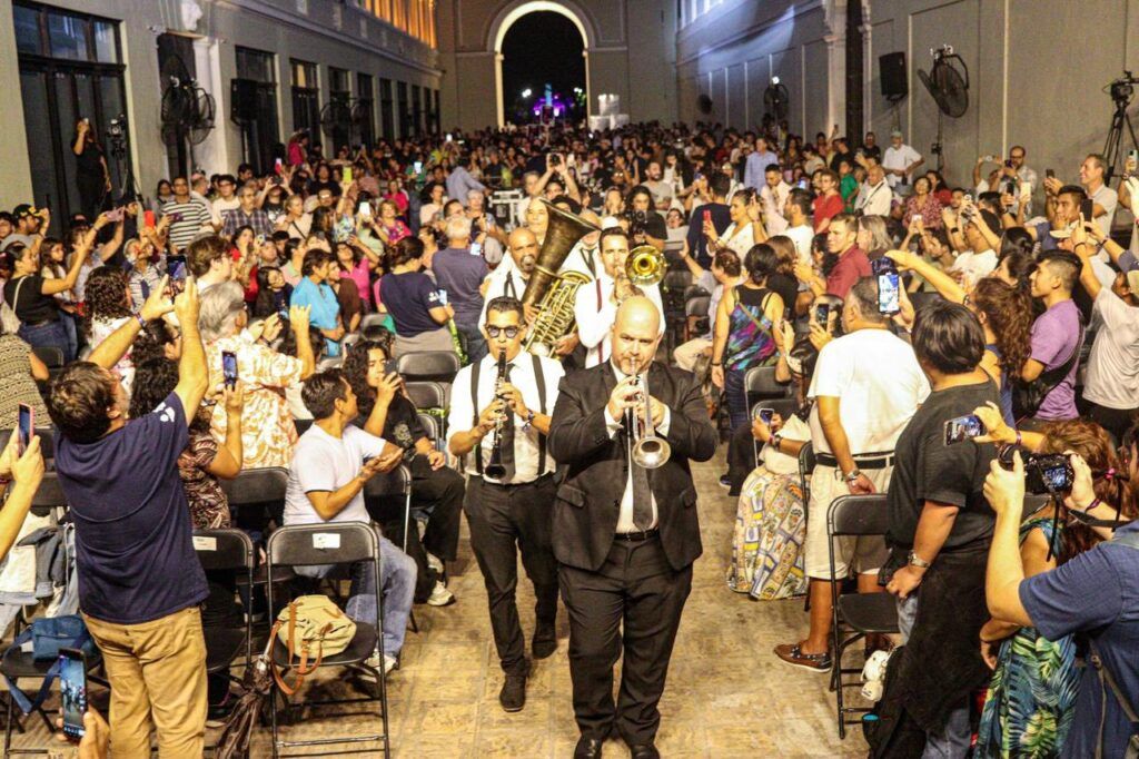 La velada inició con la presentación de la “Mérida Hot Jazz Society” excelente banda que previamente realizó un desfile estilo New Orleans. La banda estuvo integrada por conocidos músicos, yucatecos, connacionales y extranjeros establecidos en esta ciudad, que llegaron para fortalecer la escena local jazzera. Con gran entusiasmo, la banda ofreció un repertorio Dixieland que hizo bailar al público asistente: locales y visitantes, de diversas edades, evidencia clara de que hay en esta plaza un amplio segmento de adeptos al género sincopado.