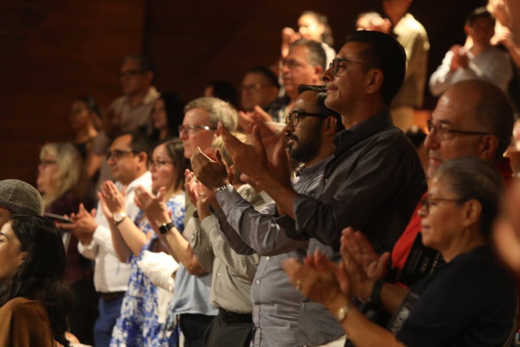 A continuación, tuvimos el estreno en nuestra ciudad de Paseo abstracto, luminoso y sonoro, de Patricia Moya, quien subió al escenario al finalizar la interpretación y recibió una ovación por parte del Respetable. Sólo había sido presentada antes en Venezuela y en Oaxaca (2018). Se trata de una suerte de recorrido por una muestra de pintura de una artista franco-venezolana amiga de la compositora (el título de la obra es de hecho el de la exposición a la que se refiere); me sorprendió un poco la asociación del arpa y la marimba, símbolos respectivos de Venezuela y México, según la maestra Moya, quién dice haber querido reflejar en su música las “pinturas abstractas y luminosas” de la artista plástica.