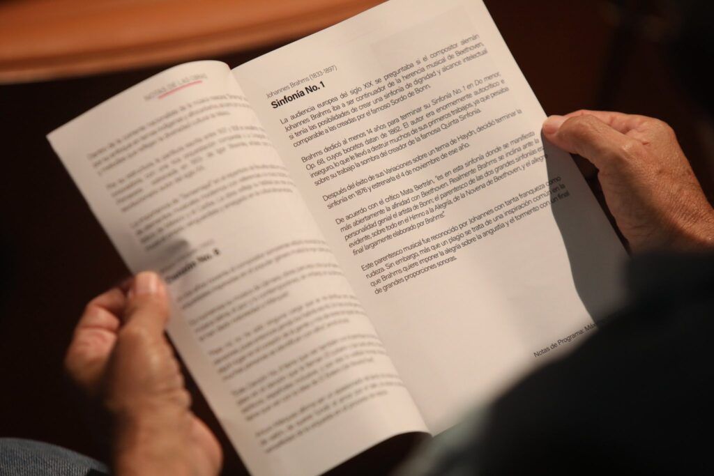 Como lo recordó Enrique Barrios, después del intermedio, Johannes Brahms tardó más de veinte años en componer su Sinfonía No 1 (Karlsruhe, 1876), y una clave posible de su comprensión sería la turbación de sus sentimientos hacia Clara, esposa y luego viuda de su gran amigo Robert Schumann; también se mencionó la profunda filiación de Brahms con Beethoven (se escuchan reminiscencias de la Quinta y de la Oda a la Alegría), hasta tal punto que a la obra interpretada en el concierto se le llamó “la décima sinfonía” del genio de Bonn.