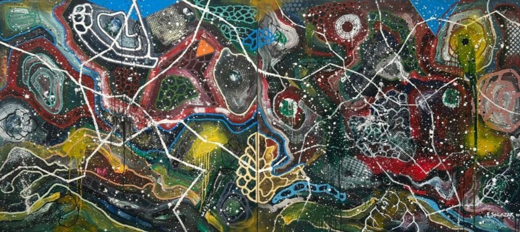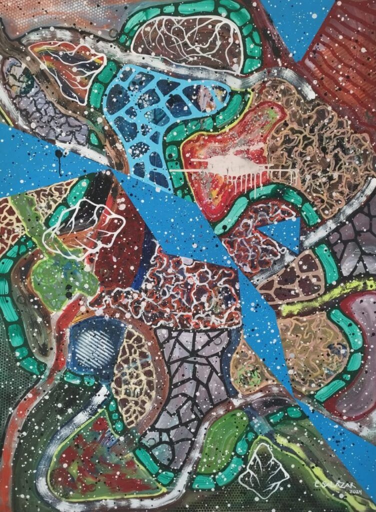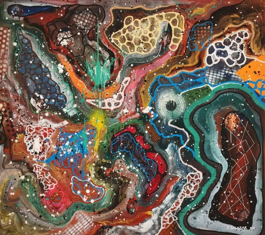 Lejos de las referencias figurativas o reconocibles, las composiciones de Salazar se construyen a partir de estructuras ondulantes y movimientos internos que parecen emanar de una vida propia. Cada trazo, cada capa de color, actúa como una pulsación vital, un flujo continuo donde el azar y la intención conviven en equilibrio. El resultado es una obra profundamente sensitiva, libre en su composición y abierta a la interpretación, donde la mirada del espectador completa el ciclo orgánico de la pintura.