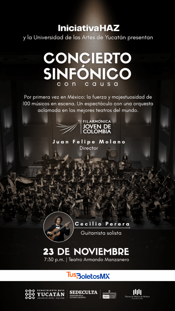 Por primera vez en México, se presentará la Filarmónica Joven de Colombia, reconocida internacionalmente por su excelencia artística y su compromiso con la formación de jóvenes talentos. La orquesta, bajo la dirección del Maestro Juan Felipe Molano, interpretará la fuerza y el mensaje eterno de libertad de la Quinta Sinfonía de Shostakovich, en una versión renovada, llena de movimiento, emoción e innovación artística. Compartirá escenario con el guitarrista yucateco Cecilio Perera, solista de destacada trayectoria internacional, quien interpretará el célebre Concierto de Aranjuez de Joaquín Rodrigo, una de las obras más emblemáticas y queridas del repertorio para guitarra clásica.