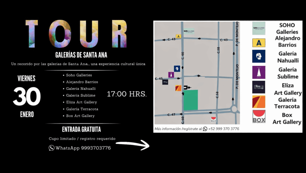 Este viernes 30 de enero, a partir de las 17:00 horas, se llevará a cabo el Tour de Galerías de Santa Ana, una experiencia cultural que invita al público a recorrer y conocer de cerca la escena artística contemporánea en uno de los barrios más emblemáticos de la ciudad: Santa Ana. En esta edición, el público visitará siete galerías ubicadas dentro del barrio de Santa Ana, punto clave del circuito cultural local. Las galerías participantes son: Soho Galleries, Alejandro Barrios, Galería Nahualli, Galería Sublime, Eliza Art Gallery, Galería Terracota y Box Art Gallery.