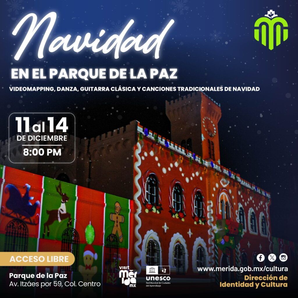 Una experiencia visual y musical llega a La Peni en el Parque de la Paz con el videomapping “Navidad en el Parque de la Paz”. La actividad se suma a la oferta cultural navideña que el Ayuntamiento de Mérida ha organizado en diciembre para que las familias disfruten esta temporada en unión, armonía y en comunidad. La dirección de Identidad y Cultura informa que las funciones están previstas los días 11, 12, 13 y 14 de diciembre y se retomarán del 18 al 23 del mismo mes, Todas inician a las 8 de la noche y cada función dura unos 50 minutos, el acceso es libre.